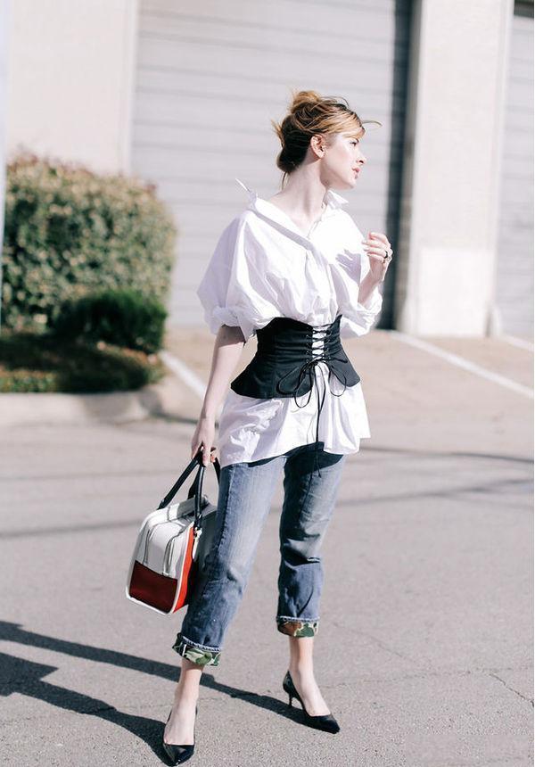 相必很多喜欢法式风格的姐妹对"衬衣打结"的穿法并不陌生,法式穿搭的特点就是优雅、美观、慵懒,而下摆打结之后显露的不仅是衬衣的飘逸浪漫还有确确实实的显瘦能力。你可能觉得衬衣打结的方式不好操作,其实不然,它需要的并不是精致的蝴蝶结而是随意一绑的美感,怎么看都不腻!穿法二、加根腰带更帅气