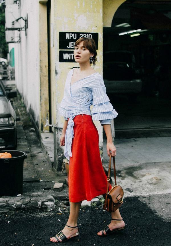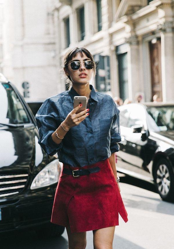 想要把衬衫穿出高级感,还要记得领口的处理。衬衣单穿时,要把最上面的两颗扣子解开,才会呈现出随性洒脱的感觉。如果觉得白色衬衣过于单调臃肿不妨增加一件收腰配饰,即增添不少时尚的气息,又能很自然分割腰身,呈现出上短下长的身材比例。这样的搭配想不爱都难!Look2:衬衣+开叉裙