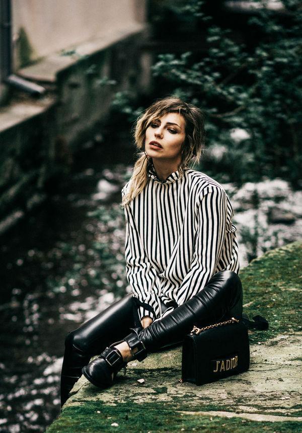 大气简约的条纹款衬衣要通过光亮的紧身皮裤来增加时髦度,颜色上最经典的黑白搭永远不过时。衬衣下摆的自然垂落刚好可以遮挡住尴尬的位置,而且这样的遮肉方式并不会显得很刻意。这经久不衰的成熟冷艳风真是韵味十足。