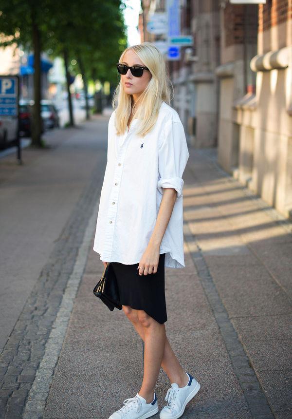 简洁百搭的白色衬衫是超级实用的经典单品,搭配黑色紧身裤十分显瘦,将衬衫打结的穿搭方式会让整个人更加干练精神。不过打结的衬衣会由中长款变成短款,没了遮腿的功效对微胖女生略显得不友好,可以搭配高跟鞋拉长身材比例达到瘦腿的视觉效果。