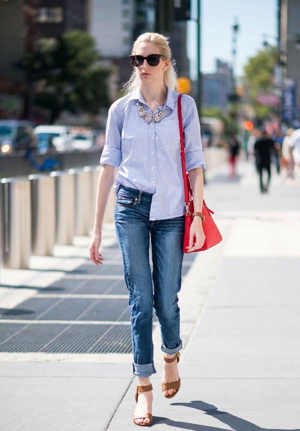 在春季,直筒裤简直就是搭配衬衣的"良配"!很多人都对它情有独钟,因为它不仅休闲随性而且清新素雅。不过女生们最看重的一点莫过于直筒裤能够完美地修饰腿型遮掩小腿肌肉,加上卷边设计还蛮清爽的。搭配露角衬衣这种典雅又富有街头的造型,经久耐看,值得推荐哦!