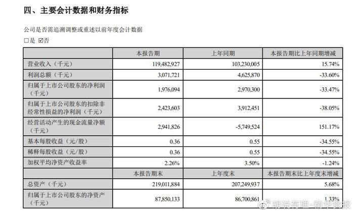 中报显示,金龙鱼今年上半年实现营业收入 1195 亿元,同比增长 15.7%;实现利润总额 30.7 亿元,同比下降 33.6%;归属于上市公司股东的净利润 19.8 亿元,同比下降 33.5%;扣除净利润 24.2 亿元,同比下降 38.1%。