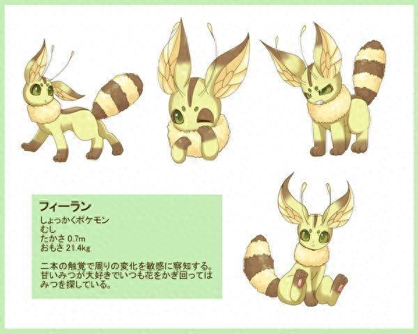 最新发现的伊布进化型之一,草本精灵,头上有如花瓣里的花蕾一般的触角,初看起来其实有点像小花猫的造型,毛茸茸的尾巴成条纹状,生气的模样有点好玩呢,看起来挺呆萌的!这是向主人宣告生气了吗?