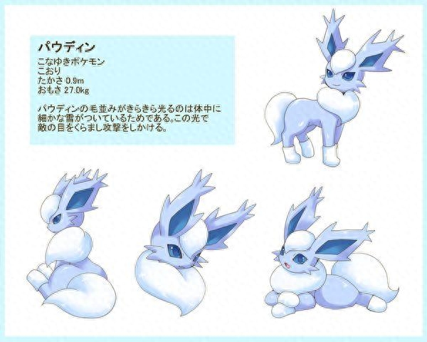 最新发现的伊布进化型之一,雪精灵,其实冰和雪是不一样的,虽然本质一样,但是形状是不同的,且硬度也不同,雪精灵有着雪特有的雪花状的耳朵,整个身体犹如是雪所堆成的,全身晶莹剔透,看起来美极了,比冰精灵还美。