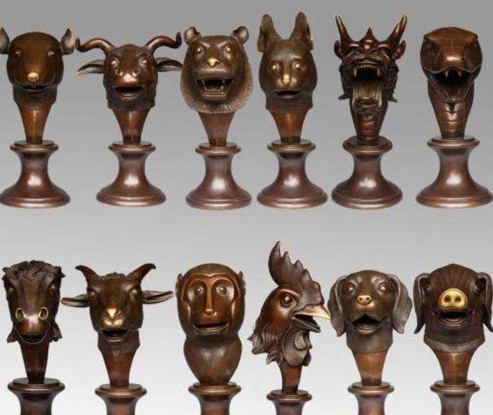 《十二生肖兽首》圆明园十二生肖兽首铜像原为圆明园海晏堂外的喷泉的一部分,1860年英法联军侵略中国,火烧圆明园,兽首铜像流失海外. 目前,十二大生肖兽首已经有7个回归中国,龙首目前在台湾保存完好,不过蛇首、鸡首、狗首、羊首则下落不明。