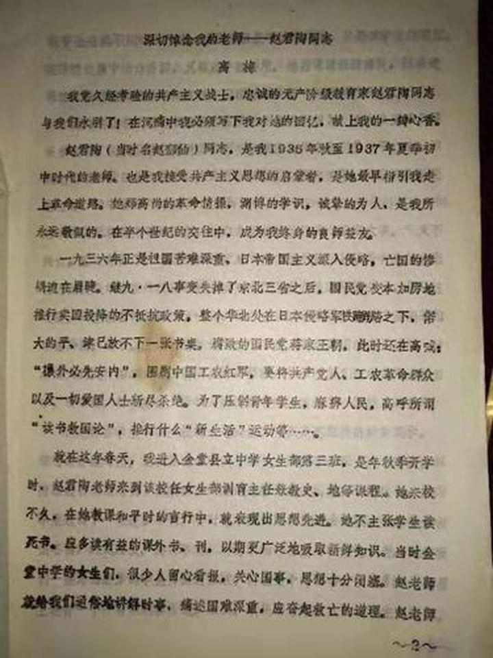 同年秋天,赵君陶被思想保守的校长解聘,离开城厢镇回到成都。这以后,她又在成都参加文化界的抗日救亡运动。赵君陶虽然离开了金堂县立中学,但她在学校播下的革命火种并未熄灭,同学们到街上和附近的乡镇继续讲演、贴标语、贴漫画,在校内排演她临走时留下抗日话剧——《沙场志士》。后来,经赵君陶教导启发的进步学生陈敏玉、李希容、傅淑权等辗转奔赴延安参加革命。