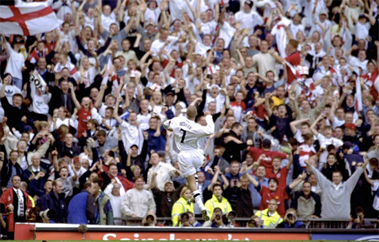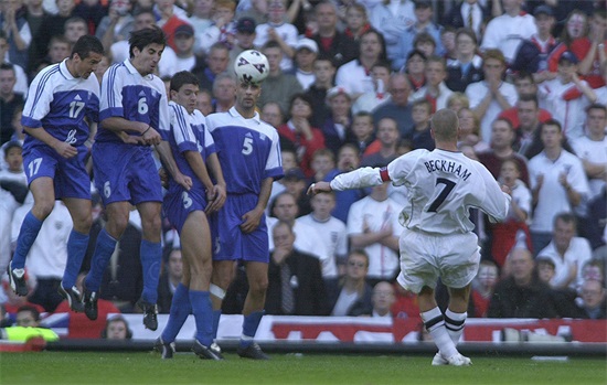 2001年世界杯预选赛欧洲赛区最后一轮,英格兰对阵希腊,英格兰打平即可直接晋级,但到最后补时阶段,比分是1-2英格兰落后,按这个比分结束的话,英格兰队将需要踢附加赛。比赛第93分钟,英格兰获得大禁区前任意球机会,也是这场比赛最后的机会了,贝克汉姆站了出来,顶住巨大压力,一记美妙的贝氏弧线直奔左上角,希腊门将眼睁睁地看着球进网。贝克汉姆一脚将英格兰踢进世界杯决赛圈。