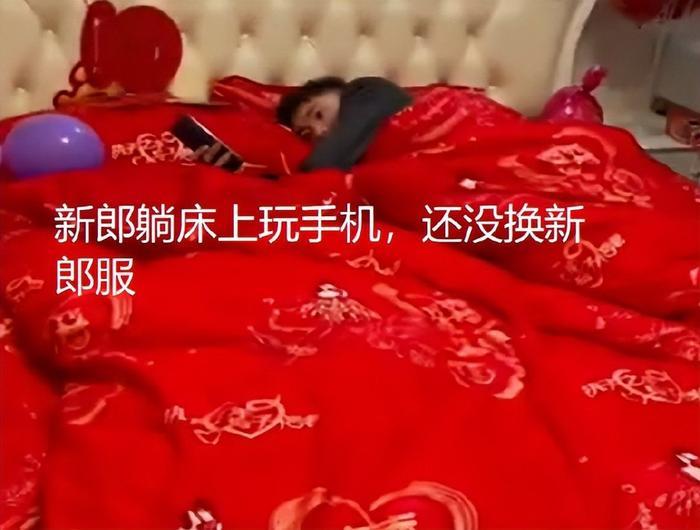 原来,新郎对这场婚礼的态度是抵制的,因此,当新娘满怀期待走进房门之后,新郎依然是一种无所谓的态度,不仅没有换上新郎服,而且还直接倒在婚床上玩手机,好似在打发时间。
