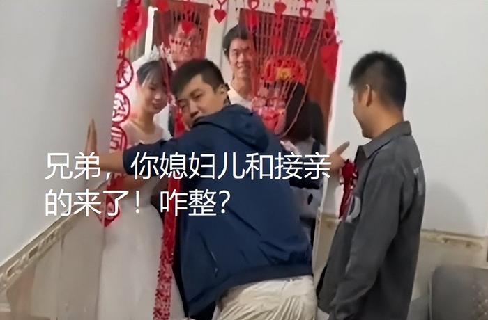 无奈下,伴郎们只能堵在门口,不让新娘和其他接亲的人进去。