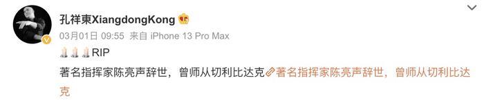 此外,在知晓陈亮声去世后,著名钢琴家孔祥东在社交平台发出三个蜡烛的表情来表达对大师的哀思,还有学生也为恩师缅怀。
