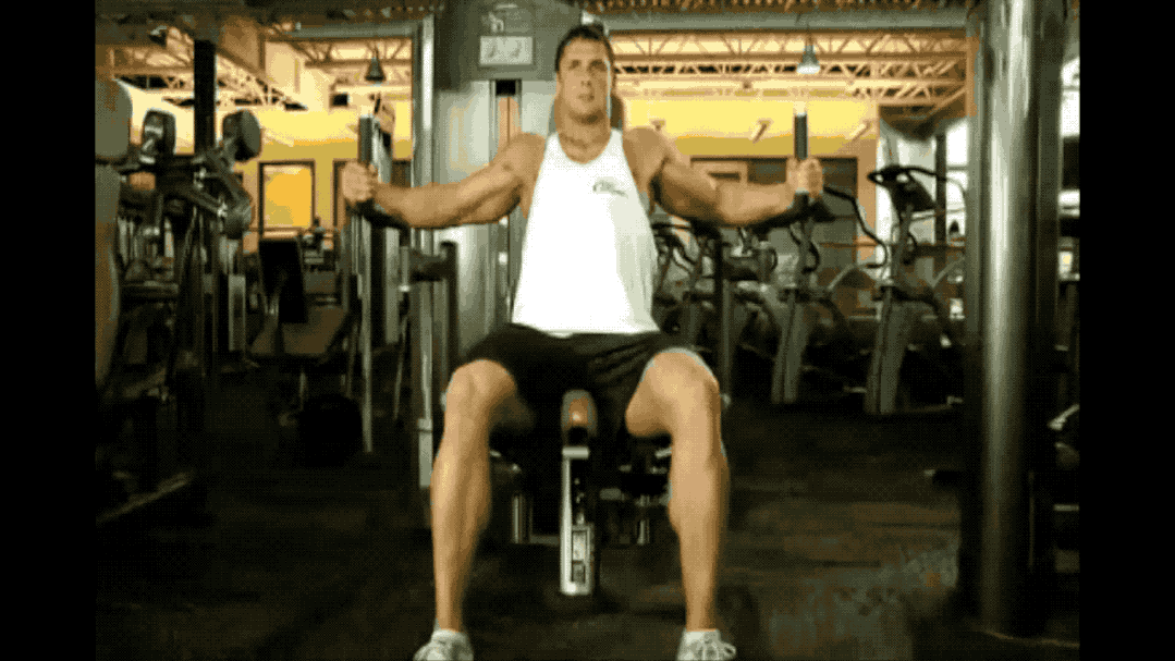 坐在蝴蝶机凳面上,背部紧靠垫板。调整坐板的高度,使之调整为前臂与地面平行的高度,胳膊不要伸直,从上向下看大臂与小臂夹角略呈135度角。稳定肩膀,不要耸肩,将两个把手缓慢的靠拢,挤压胸部。吸气打开,呼气收缩,打开始终保持胸部肌肉发力,缓慢的回到起始位置。