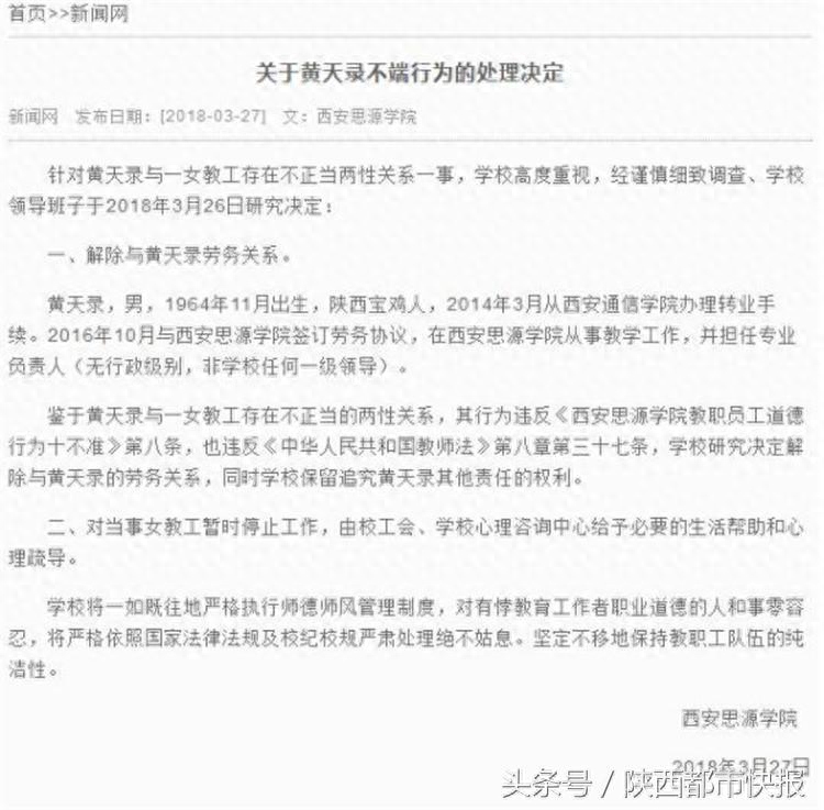 处理决定里说,黄天录,1964年出生,宝鸡人,2014年3月从西安通信学院办理转业手续。2016年10月与西安思源学院签订劳务协议,在西安思源学院从事教学工作,并担任专业负责人(无行政级别,非学校任何一级领导)。鉴于黄天录与一女教工存在不正当的两性关系,其行为违反《西安思源学院教职员工道德行为十不准》第八条,也违反《中华人民共和国教师法》第八章第三十七条,学校研究决定解除与黄天录的劳务关系,同时学校保留追究黄天录其他责任的权利。