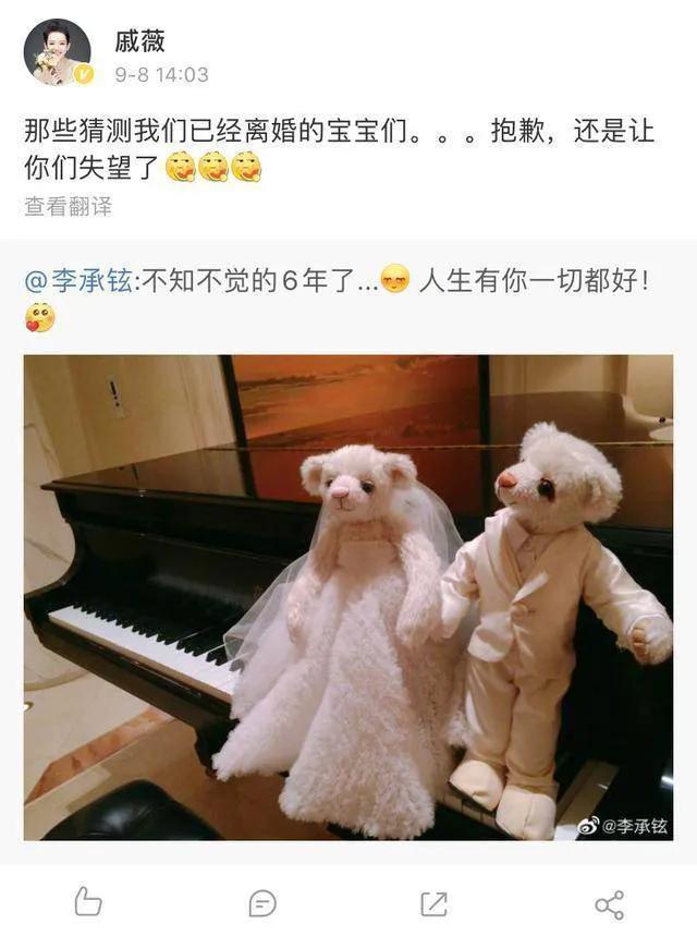 直到9月8日,李承铉在公众号发文庆祝6周年结婚纪念日,谣言不攻自破,戚薇转发了李承铉的博文,并配文:那些猜测我们离婚的宝宝们,抱歉,还是让你们失望了。