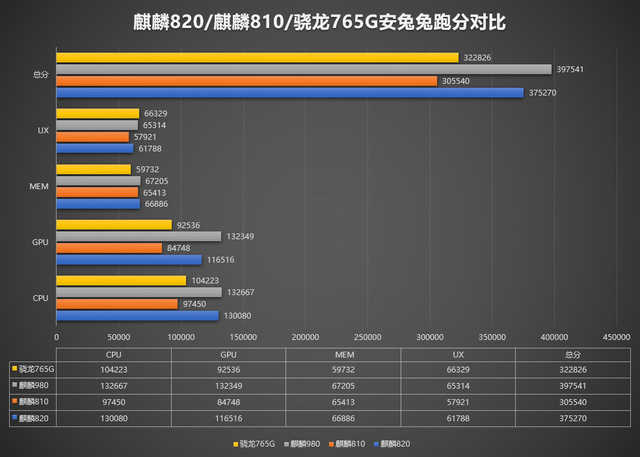 总体来说,麒麟820性能明显领先骁龙765G,略微落后麒麟?980(GPU差一点),但比麒麟?980多一个集成基带的优势。可能能与之匹敌的是联发科的天玑1000L了。