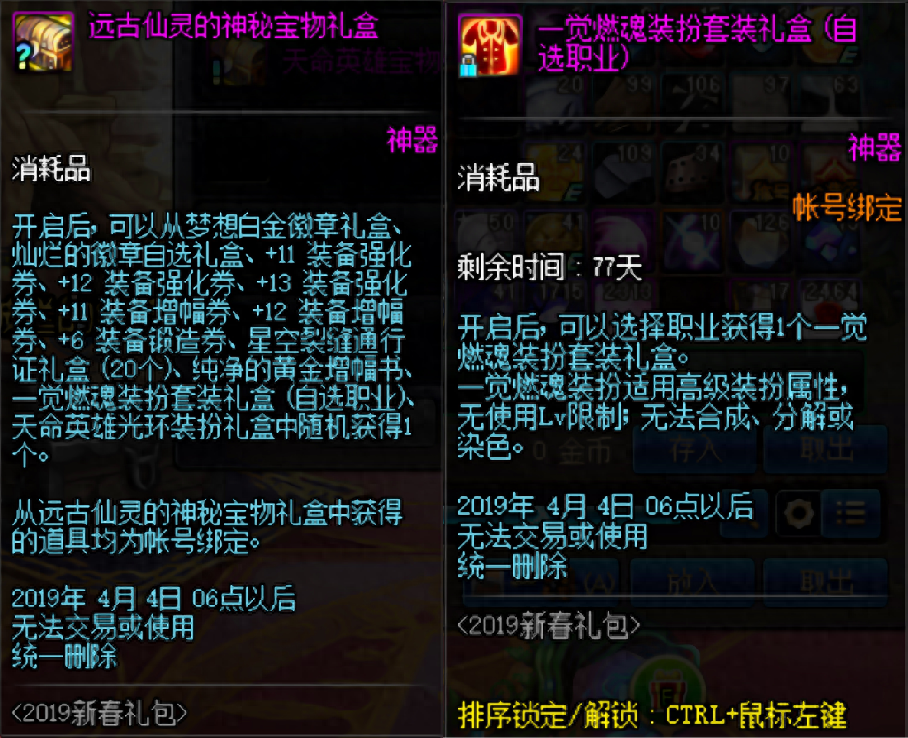 如果我们选择的是远古仙灵的神秘宝物礼盒,那么就是随机去开启宝物礼盒内的东西,如果拿到的是一觉燃魂装扮套装礼盒,那么我们开启的就是一整套的觉醒装扮了,大家对比一下就发现了,随机的显示的是套装,自选的没有套装字样,这样大家懂了吧。