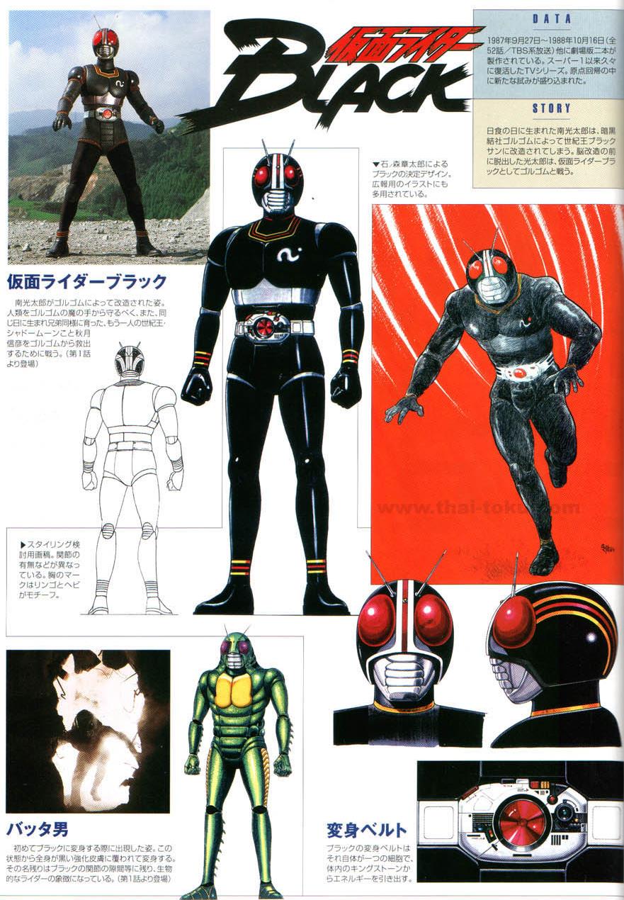 假面骑士Black,继续保持蝗虫为原型的设计,身体外壳上却多了一分黑色的盔甲质感。在南光太郎变身为假面骑士Black之前,还有一个绿色的蝗虫改造人形态。设计图如下。