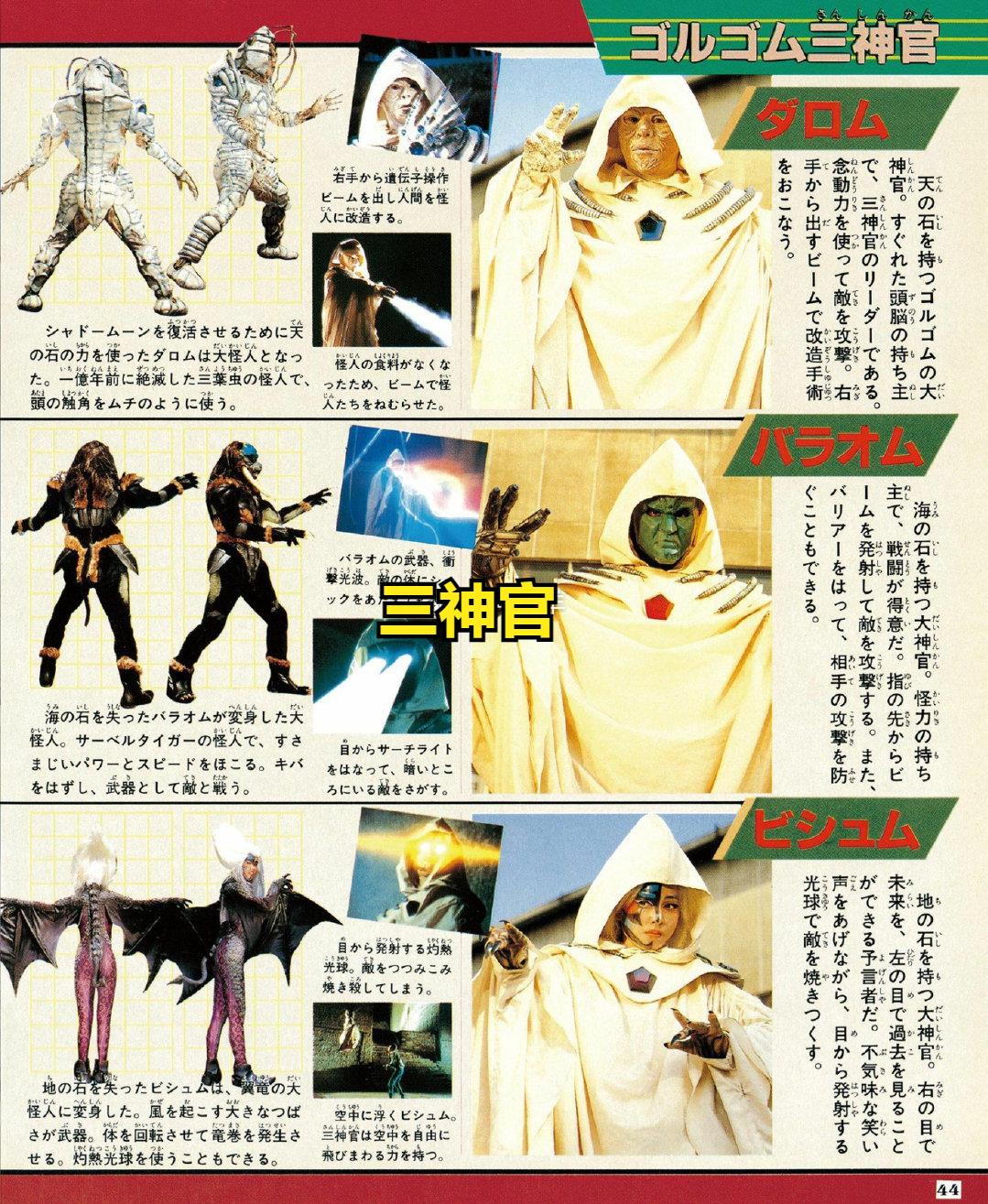 除了位于顶点的创世王与世纪王以外,“戈尔戈姆”组织的最高干部就是三神官了。三神官只有怪人中特别优秀者才能被选上,分别以天之石、海之石、地之石为生命力量来源,是实力强大的怪人指挥官。