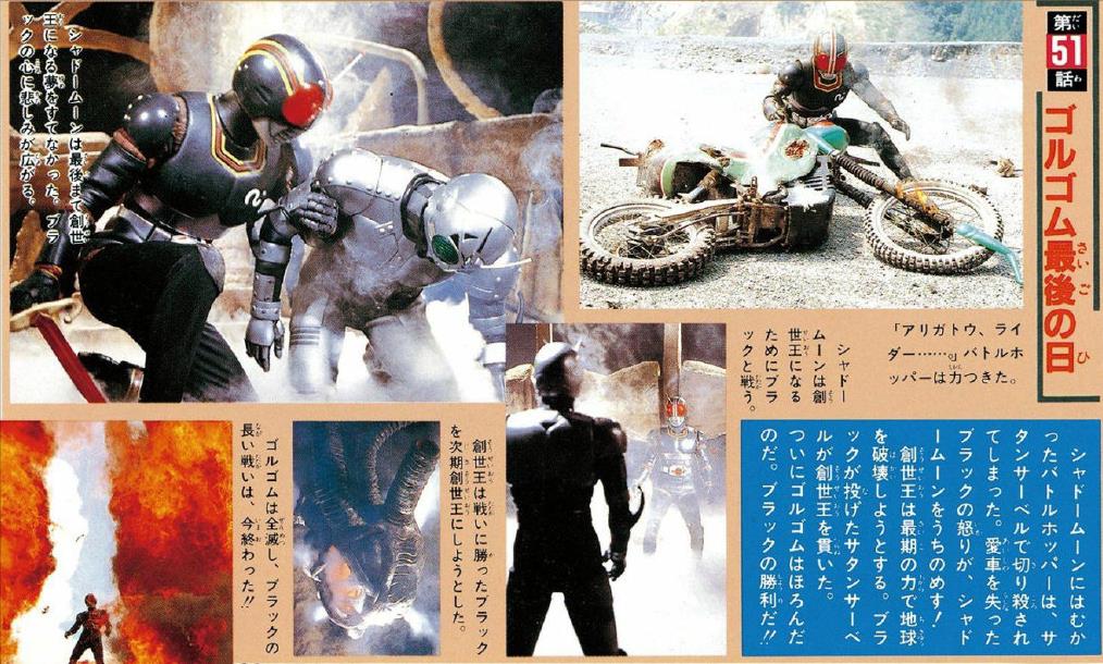 在故事的最后,假面骑士Black彻底击败了“影月”,并利用“撒旦军刀”击倒了上一代的邪恶组织创世王。