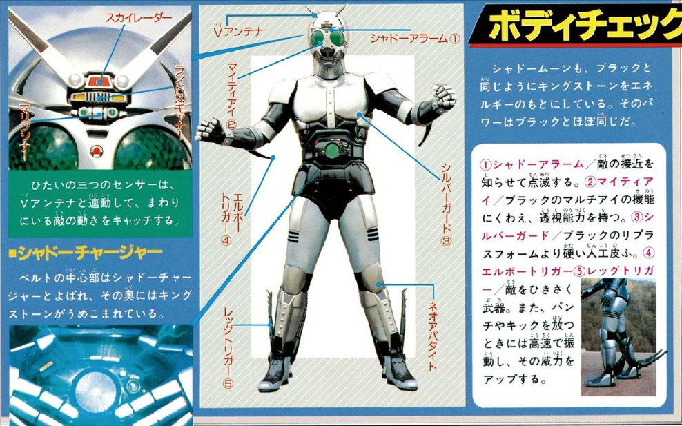 秋月信彦被“戈尔戈姆”组织改造植入“月之石”后,变身成为了世纪王之一的“影月”,以“撒旦军刀”为武器。外形上,充满了凌厉的银灰色金属质感。“影月”设计如下图。