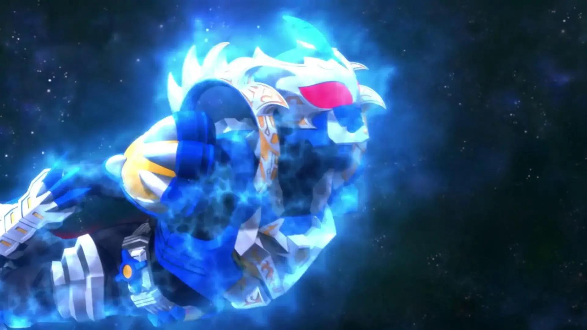 由风鹰侠腾空而起,以飞踢瞬间击中敌人,完成封印的技能。