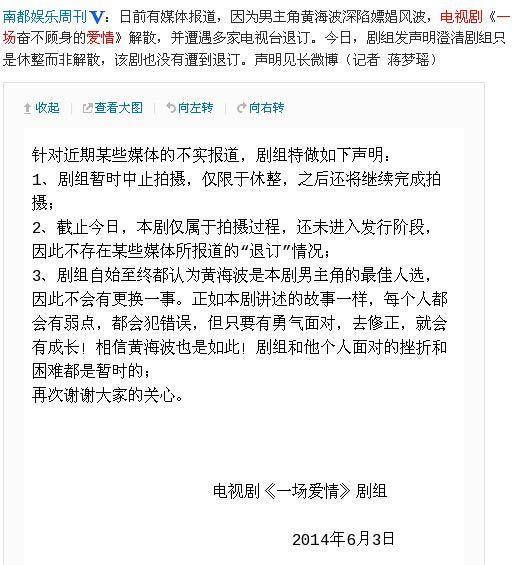 据说黄海波嫖娼事件,正是发生在剧组拍摄期间,该剧组在知道黄海波惹上这么大“丑闻”的情况下,依然没有换人,一直等着黄海波回来,“每个人都会有弱点,都会犯错误,但只要有勇气面对,去修正,就会有成长!”