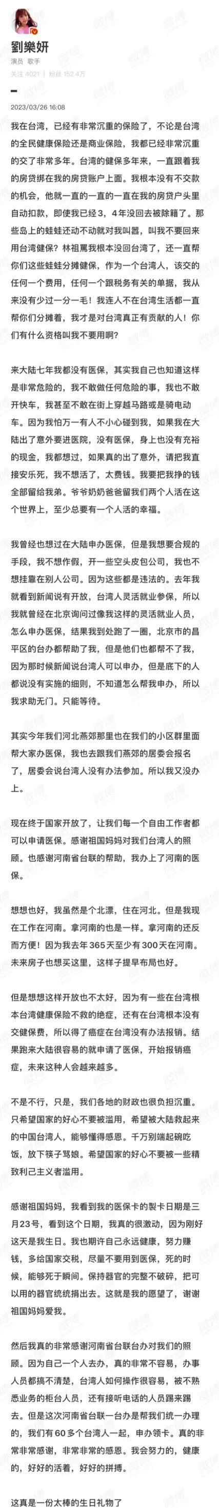3月26号,刘乐妍发长文,表示自己终于拿到了大陆的社保卡。