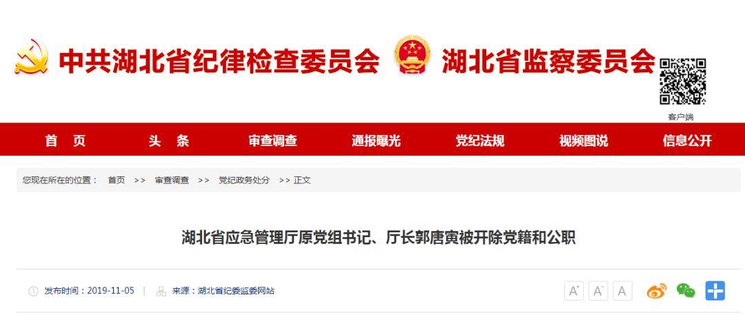 湖北省纪委监委11月5日通报:湖北省应急管理厅原党组书记、厅长郭唐寅被开除党籍和公职,并移送司法机关依法处理。