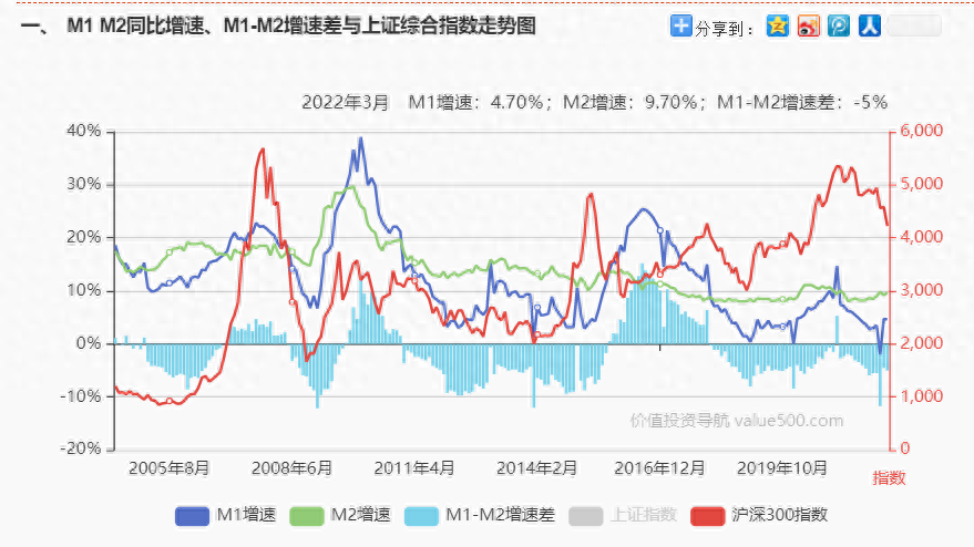 从上图我们可以看出,验证了我上讲说的,M1增速与股市也是存在正相关的关系。大家可以好好观察一下,看看M1-M2和股市是否也有缕缕关系?