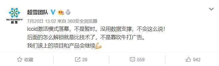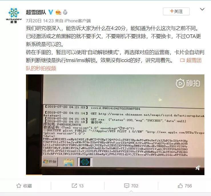 “超雪团队”7月20日就在微博上表示,“不要手欠,不要刷机不要抹除,不要换卡,不过OTA更新系统是可以的。砖在手里的,暂且可以使用“自动解锁模式”,再选择对应的运营商,卡片会自动判断判断继续是执行TMSI、IMSI解锁。效果没有ICCID的好,将就用着先。”