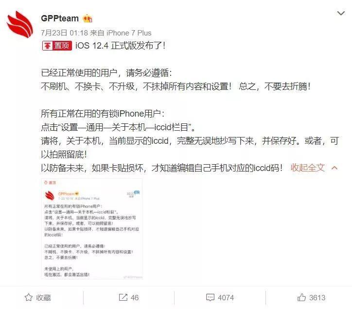 破解团队“GPPteam”也在微博置顶中告诫用户:“刷机、不换卡、不升级,不抹掉所有内容和设置!总之,不要去折腾!”