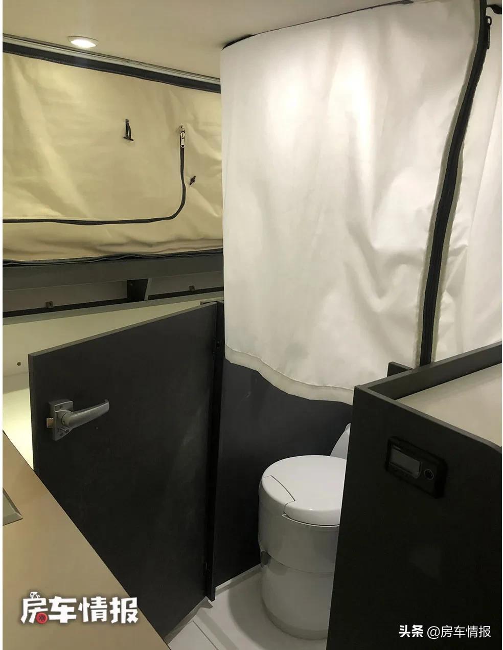 储物柜后方则是全车的卫浴室,常规状态下是半开门的样式,上方则是软帘的设计,不过相互结合也可以变成一间独立的卫浴室,内部提供了基础的马桶和淋浴花洒,满足日常的基础洗漱需求还是没问题的。