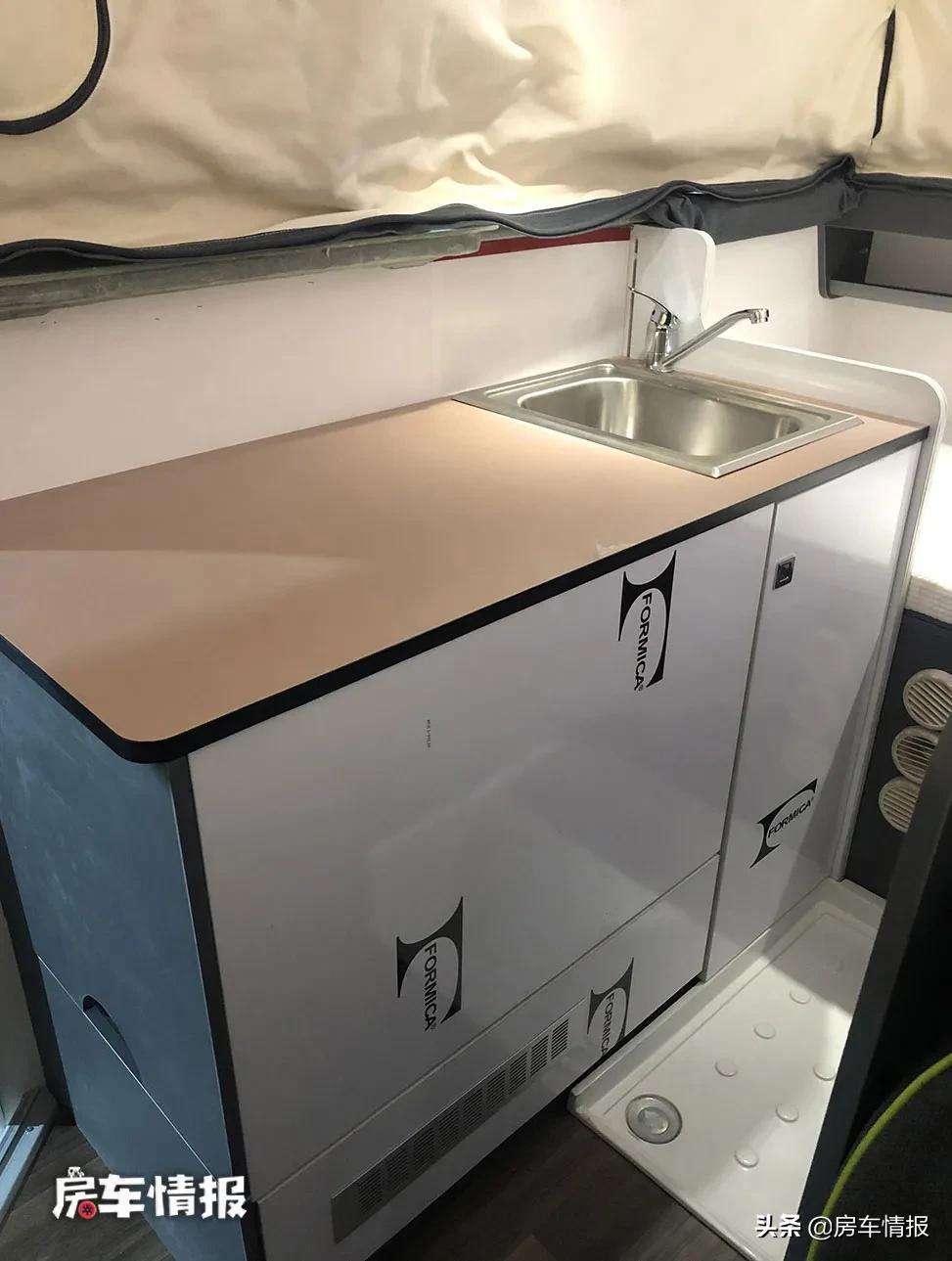 全车的厨房区位于乘客门的后方,提供一个长条的操作台,台面上带有基础的不锈钢水槽,侧面还带有可以拓展的延展桌板,下方则是一些基础的储物空间,以满足日常的储物需求。