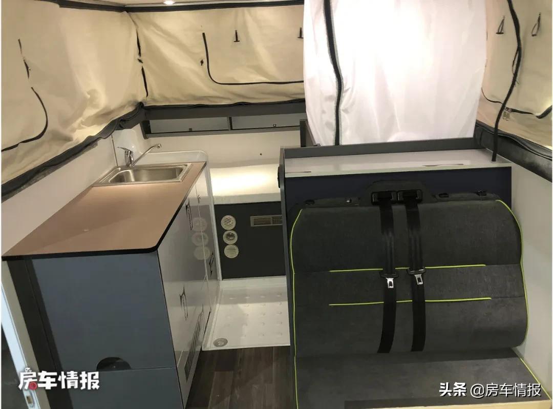从照片中可以看到,其顶部的升顶机构采用直立升降模式,区别于以往我们常见的斜坡式升顶,这样就可以保证内部的生活区空间从前到后都能拥有比较不错的纵向空间,也能够正常的直立行走或活动。