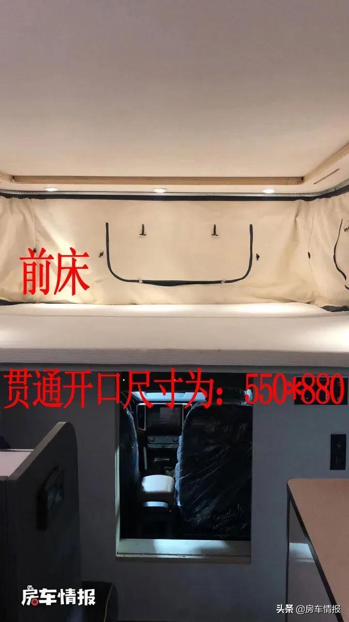 最前方位于驾驶室上方是全车的主休息区,平时可以满足两个人的日常休息需求,床板下方不同于常规版的长城炮房车,并不是直接相通的,而是在驾驶室和生活区之间做了一个小型的贯通开口,其尺寸为550mm*880mm。