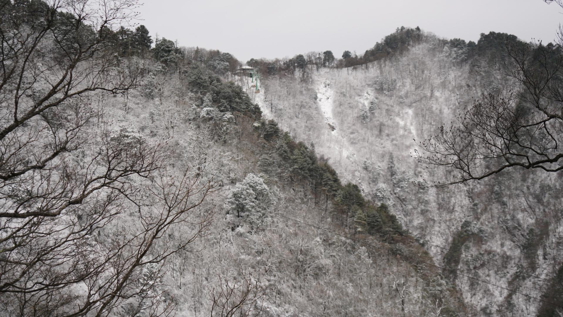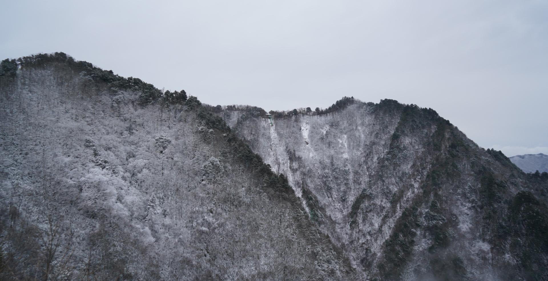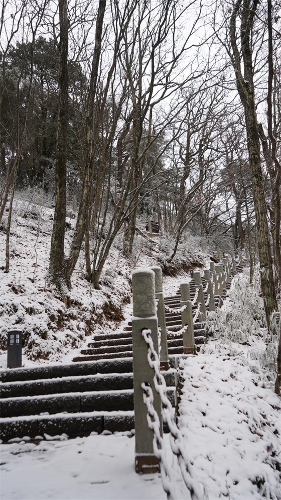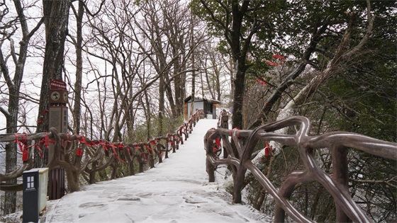 早上进山时下着小雨,购票时服务人员说山上下雪了。心里暗喜:太棒了!进入景区大门先参观博物馆,了解一下鬼谷子的历史。进山的乘车点在博物馆后,游玩人少,我们坐了专车上山,行进中即开始飘雪花,约15分钟左右的盘山路即抵达下车点。打开车门迎面扑来狂欢的雪花,满眼的银装素裹很是令人兴奋。约在一天门(或是二天门)处有一个观景台,刚好雪停,在观景台处看山涧云雾升腾、山体若隐若现,很是壮观。