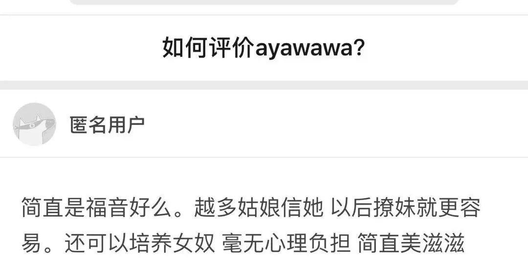 此前,这位号称“情感教主”的ayawawa因一段关于“慰安妇”的不当言论,被上千万网友围观和狂喷。