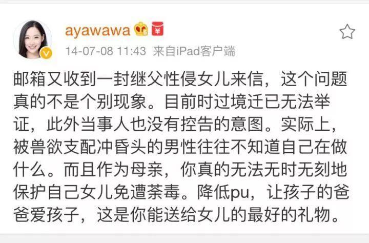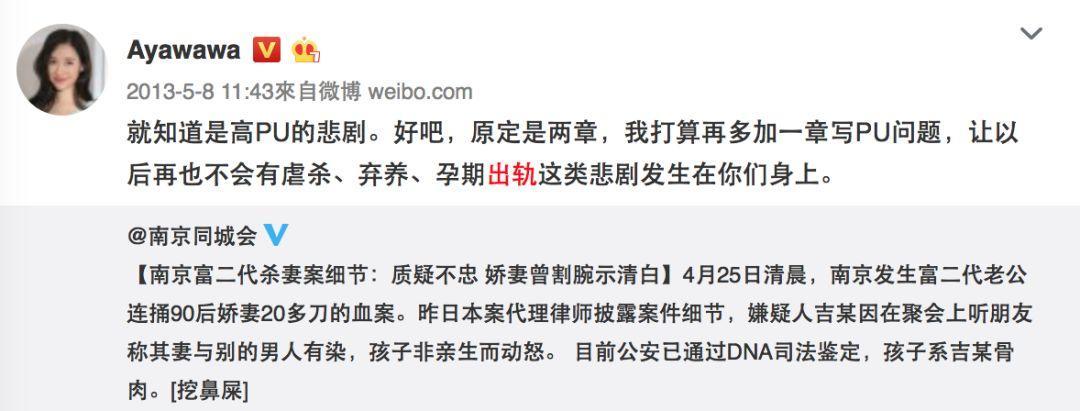而早前南京曾发生过一起妻子被富二代老公20多刀致死的惨案,这在ayawawa的口中,那个杀人犯没有错,是因为妻子PU过高才导致的!