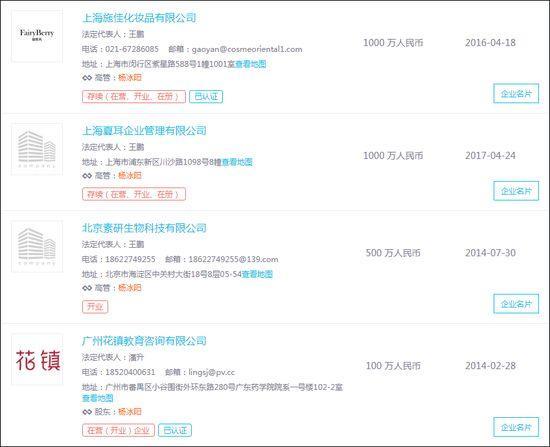 据观察者网查询,目前,疑似由杨冰阳担任股东或高管的企业至少有四家,分别为上海施加化妆品有限公司、上海夏尔企业管理有限公司、北京素研生物科技有限公司,以及广州花镇教育咨询有限公司。