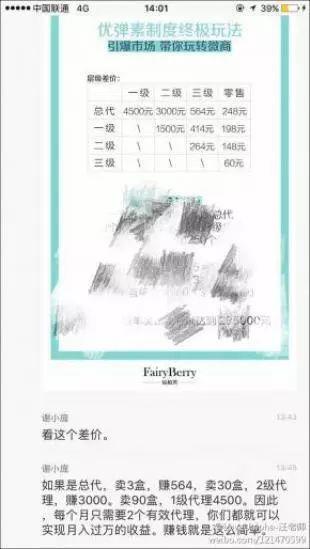 而曾有媒体报道称,优弹素的创始人就是Ayawawa的丈夫王鹏,而优弹素官网则显示,“优弹素在所有微商渠道的销售价格均为一致,如想咨询购买产品,您可以选择朋友圈中正规、被授权的优弹素代理进行详细了解”。