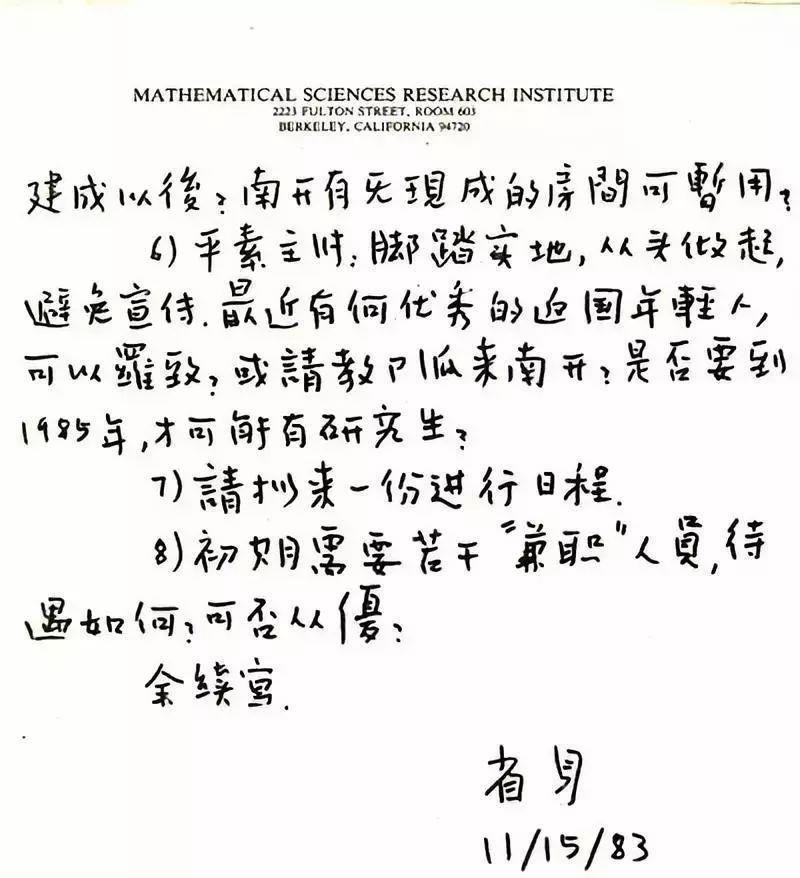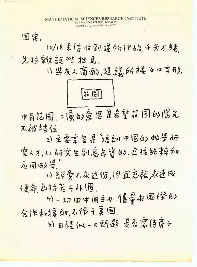 陈省身给胡国定的书信,对南开数学所的筹建的建议1