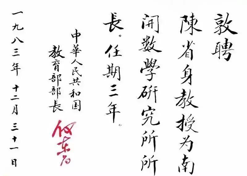 教育部颁发的聘请陈省身为南开数学研究所所长的聘书