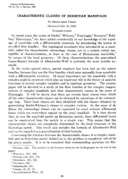 1946年他发表了第二篇代表作《埃尔米特流形示性类》。这两篇论文奠定了陈省身在微分几何学的地位,著名的“陈示性类”对整个数学乃至物理的发展都产生了广泛而又深刻的影响。