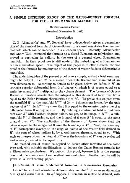 1944年,陈省身发表了他的划时代论文《闭黎曼流行的高斯-博内公式的一个简单内蕴证明》。他将高斯-博内公式推广到高维曲面和紧致流行上,这一研究成果引起了国际微分几何学界的震惊。