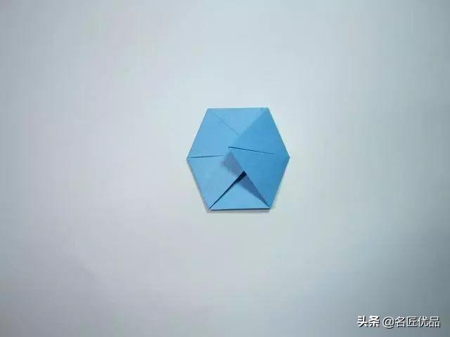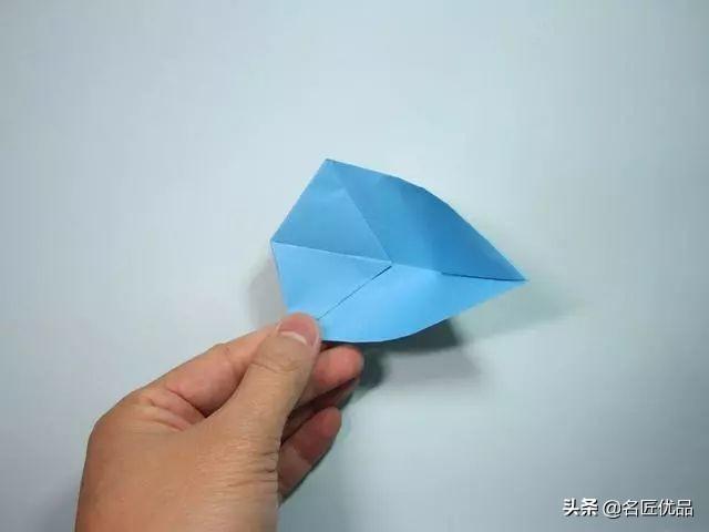 翻面,将左右两侧露出来的两个三角形,分别沿着三角形的两个底角向内部翻折。