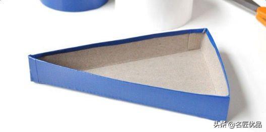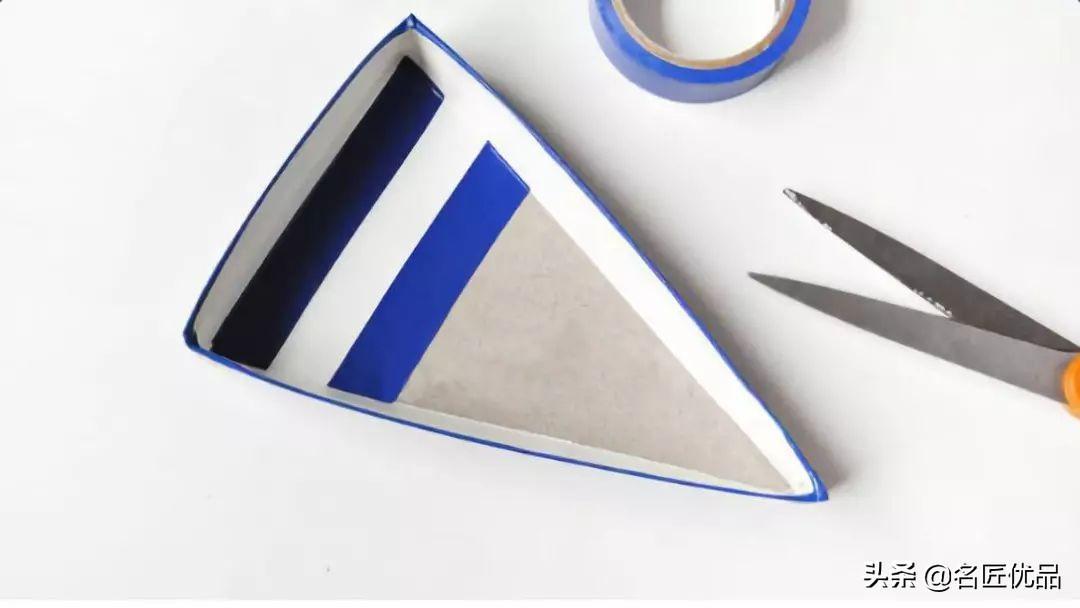 将剪下来的三角盒平面折叠粘贴固定成立体的,如图,然后用胶带将其包装成有颜色的外盒,在利用白色和蓝色胶带将其内盒进行条状装饰,在彩纸上剪出三角形,粘贴在竹签上做成小旗