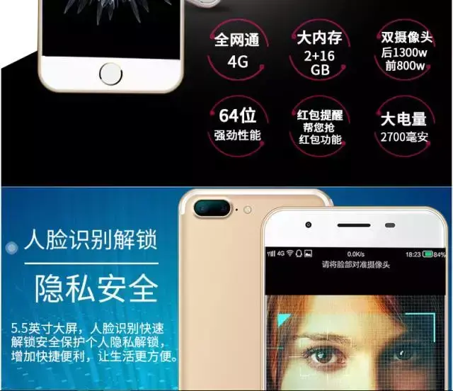 这手机也是很牛逼的,不仅有大内存2+16GB,也有人脸识别技术,堪比三星旗舰!还有64位架构的强劲性能,这宣传的文案真是牛