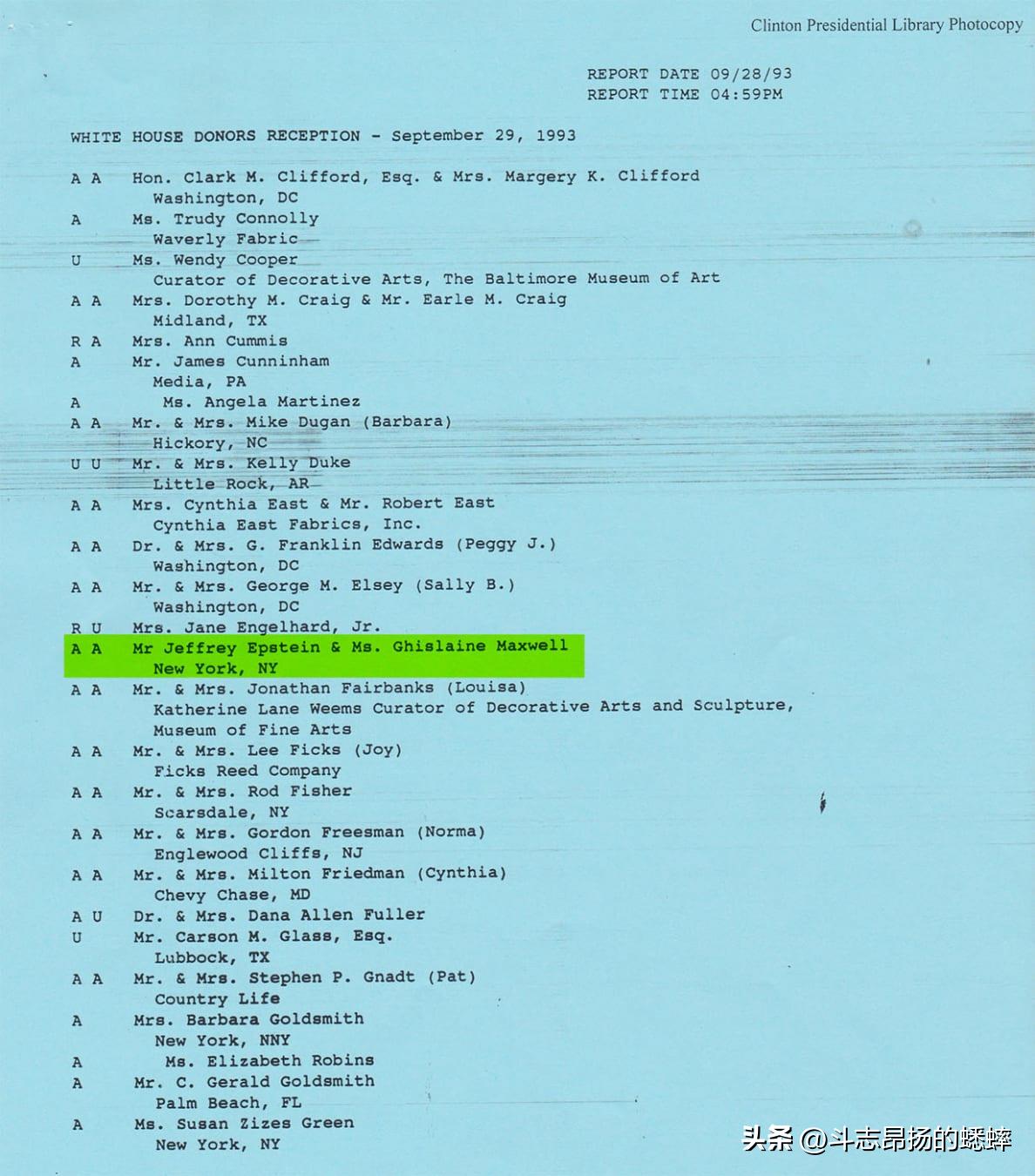 根据邀请名单,此次活动的嘉宾包括记者兼慈善家芭芭拉·戈德史密斯、女继承人简·恩格尔哈德、政治顾问辛西娅·弗里德曼,以及“杰弗里·爱泼斯坦先生和吉斯莱恩·麦克斯韦女士”。遗憾的是爱泼斯坦和麦克斯韦没有出现在“名单”上,他们两人的名字旁边都有一个字母“A”,表明他们计划参加。希拉里克林顿办公室发布的活动新闻稿将爱泼斯坦列为白宫历史协会的捐助者。