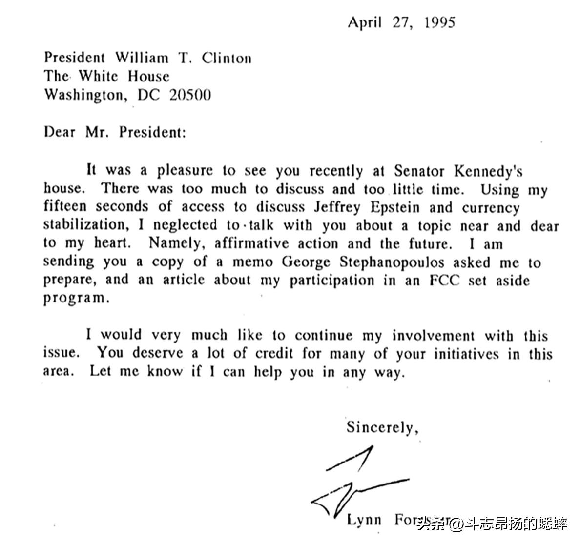在 1995 年的信中,Forester de Rothschild 写道:“亲爱的总统先生:很高兴最近在肯尼迪参议员的家中见到您。要讨论的太多,时间太少。我用十五秒的时间讨论杰弗里·爱泼斯坦和货币稳定,却忘了和你谈谈我最关心的话题。即,平权行动和未来。” 然后她继续指出,她正在向他发送一份关于后一个主题的备忘录,这是乔治·斯特凡诺普洛斯 (George Stephanopoulos) 要求她写的,并签了字,“此致,林恩·福雷斯特 (Lynn Forester)。”