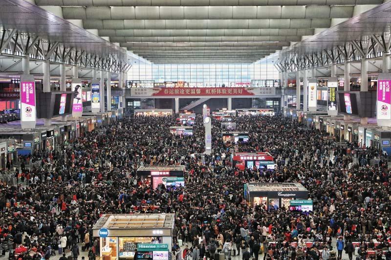 车站候车大厅面积约11340平方米,最高可同时容纳1万人候车。候车大厅是全开放的空间,不设立分隔的候车室,旅客进入站厅后,可以在候车区域内等候,也可前往商铺购物或到观光平台游览。[22]旅客可通过南北高架平台、各条公交线路直接进站,地下可从交通换乘大厅乘坐自动扶梯进入候车厅。[5]检票口主要分列在候车大厅两侧,检票口上方的电子屏幕显示车次名称和开车时间,旅客可根据车票上的信息选择相应检票口就近候车;每个检票口都设有自动检票闸机,上面标有“磁票入口”、“刷卡区”等字样,车次开检时乘客使用车票或二代身份证检验无误后闸机就会开放。[23]