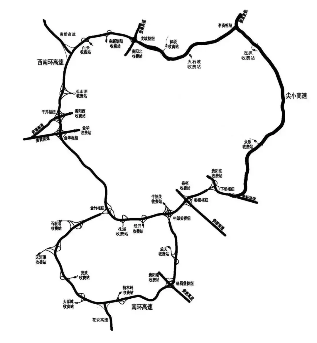 行驶路径为西南环线、南环线、尖小线组成的贵阳市绕城高速路网与各条高速公路(贵遵、贵清、贵黄、贵惠、贵都、贵新)的部分路段及其涉及的收费站构成,共涉及22个收费站点,具体如下:
